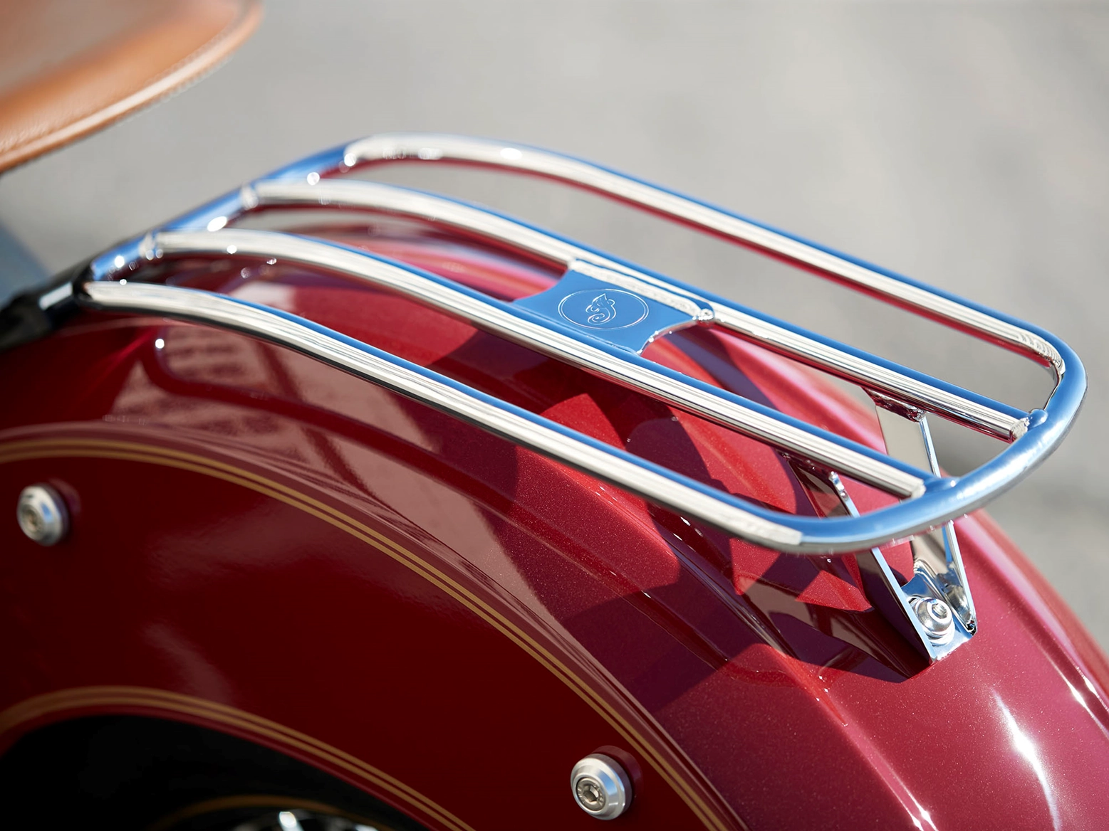 Новинка постоянно ссылается на своего прародителя, но внутри видим современный стандартный двигатель V-twin Scout объемом 1,133 куб. см с жидкостным охлаждением. Между чернеными цилиндрами гордо красуется значок столетия. Ах да, для модели в честь круглой даты – 100 лошадиных сил. Красивое решение.