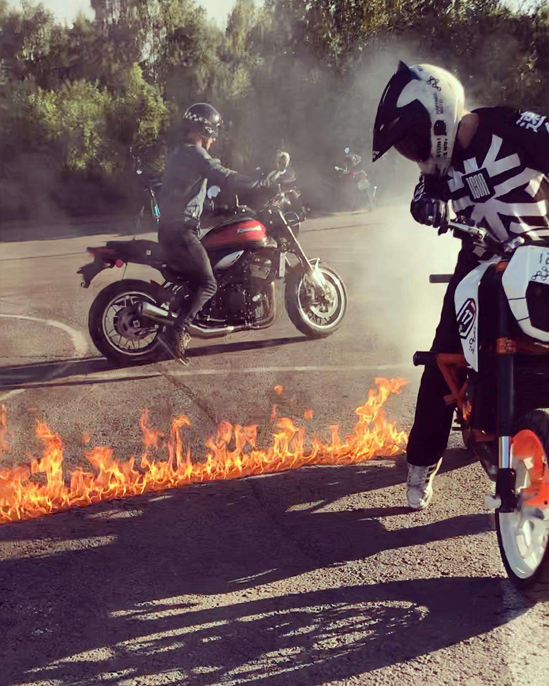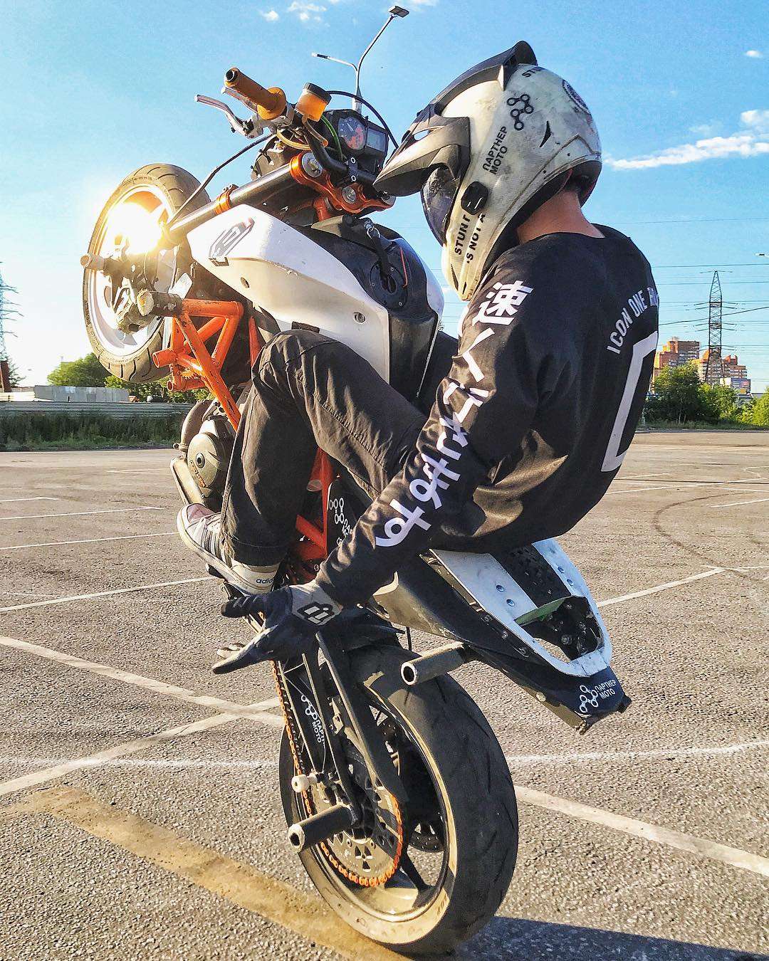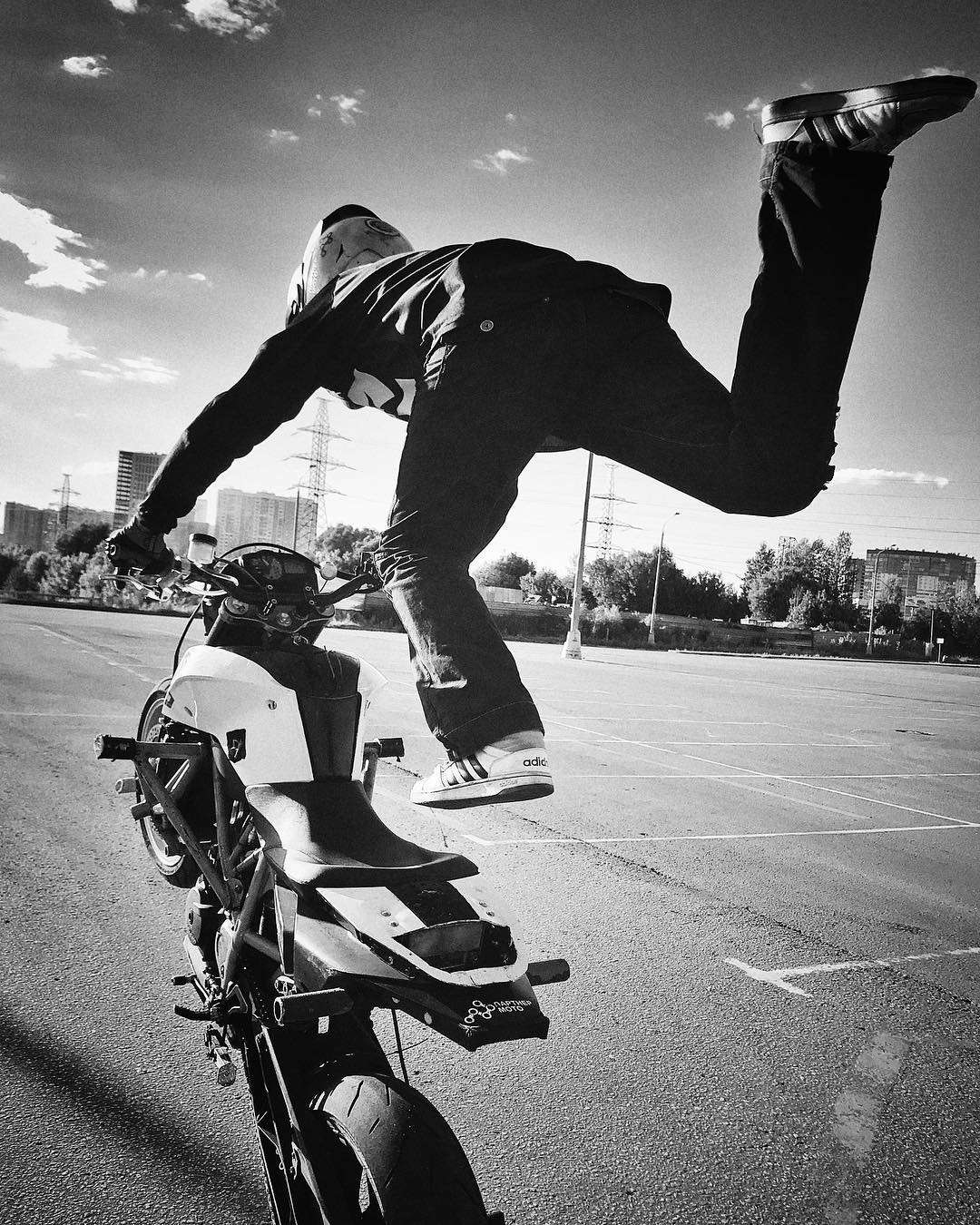 Дмитрий: Еще катаясь на скутере, я увидел на парковке ребят, которые поднимали мотоцикл на заднее колесо, стала интересна эта тема и я начал искать видео в интернете, далее к 15 годам я променял скутер на kawasaki ksr80, но стант на нем не шел. И я просто катался так как не было компании. В 16 лет я получил экстерном права и взял мотард wr250x, появилась возможность ездить на площадки и тренироваться в компании более опытных стантрайдеров. Это играет важную роль, когда есть рядом люди от которых можно перенимать опыт.