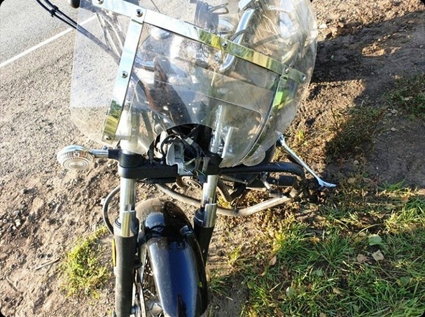 Антон показал мотоцикл после падения. Байк кувыркался по обочине и минимум один раз упал вверх ногами. Владелец указывает, что ветровое стекло сделано из поликарбоната, как и визор шлема, с разницей по толщине.