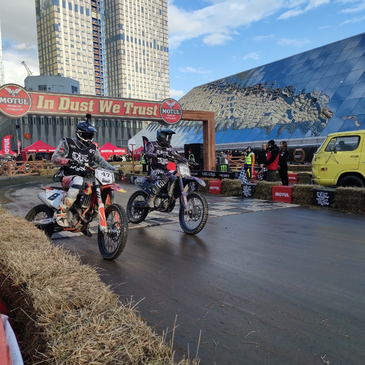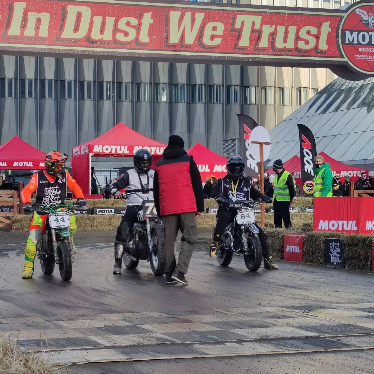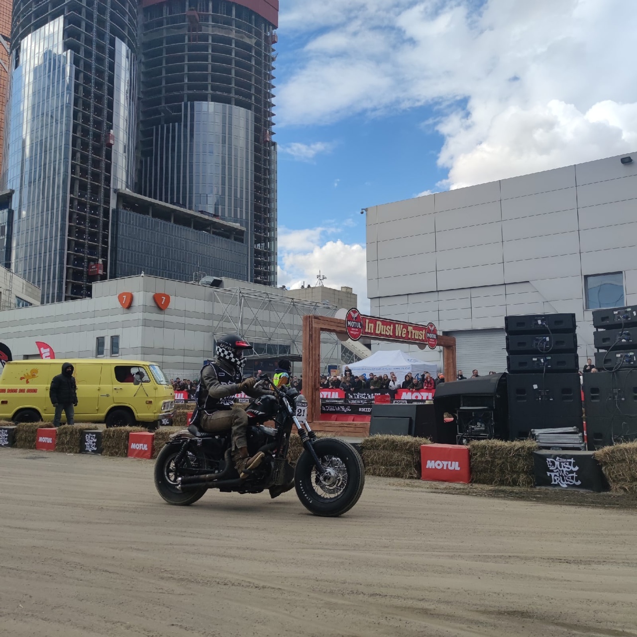 Крытым павильоном история не закончилась. Как выразились участники, грамотное использование клочка земли превратило участок в трассу соревнований флэт-трек «Motul In Dust We Trust». Каждый, кто выходил на улицу, не мог пройти мимо. Гравий, вылетающий на поворотах, звук мотора, азарт кто-кого… Искра, эмоций, сорванный голос, сотни ярких кадров и запал у зрителей. Никто не ушел без впечатлений. Каждый нашел что-то по душе.