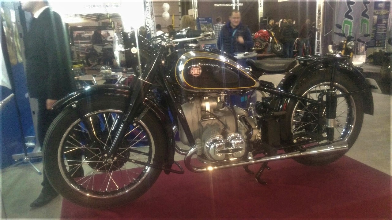 Прошлая выставка была огромным павильоном, в этот раз она разделена на две куда более скромные части. На входе в главный павильон я встретила его... М-80 (Горьковского мотоциклетного завода, 1946год!) для шоссейно-кольцевых гонок, реставрация мастера Шаманского. Я как любой ботаник тяготею к ретро и пройти мимо этого парня было невозможно. Он так хитро поблескивал хромом, но ведущий уже объявлял открытие выставки. На главной сцене организаторы разрезали символическую ленточку.