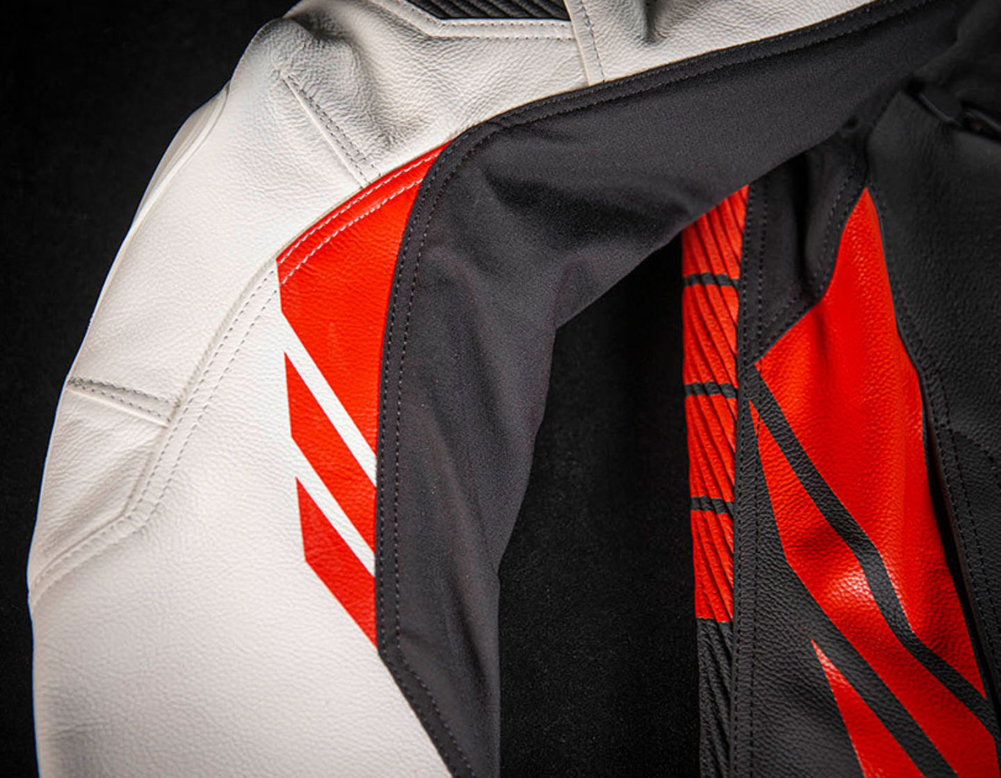 Материалы выполнены из комбинации коровьей кожи особой выделки — TrackSpec, толщина которой составляет 1.1-1.3 мм и текстильных вставок. Если присмотреться, то заметны эластичные вставки, уровень как у трекового комбинезона!
