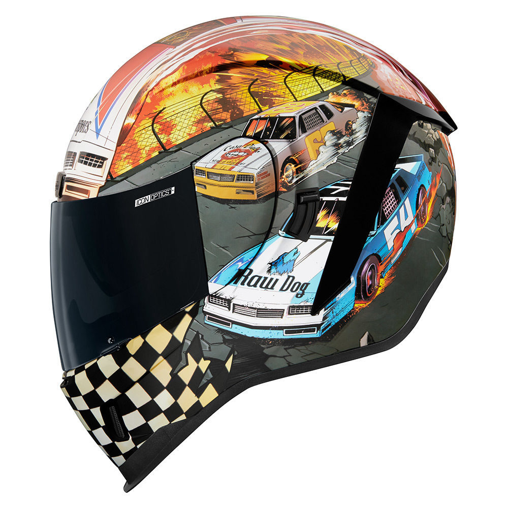 Шлем включает в себя прозрачный и темный быстросменный визор Icon Optics™ с системой защиты от запотевания экрана Prolock™. Включает встроенные очки DropShield™.