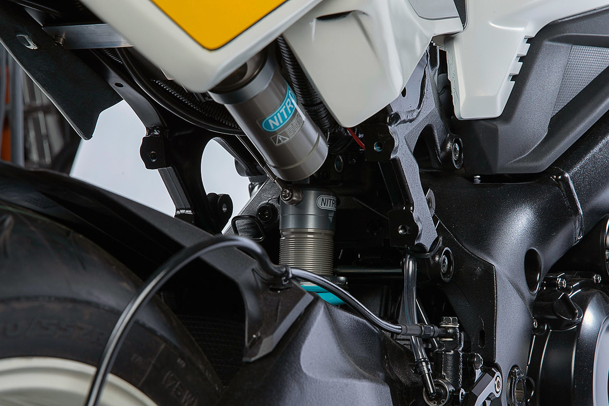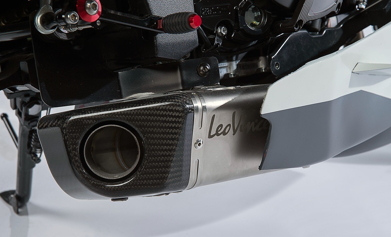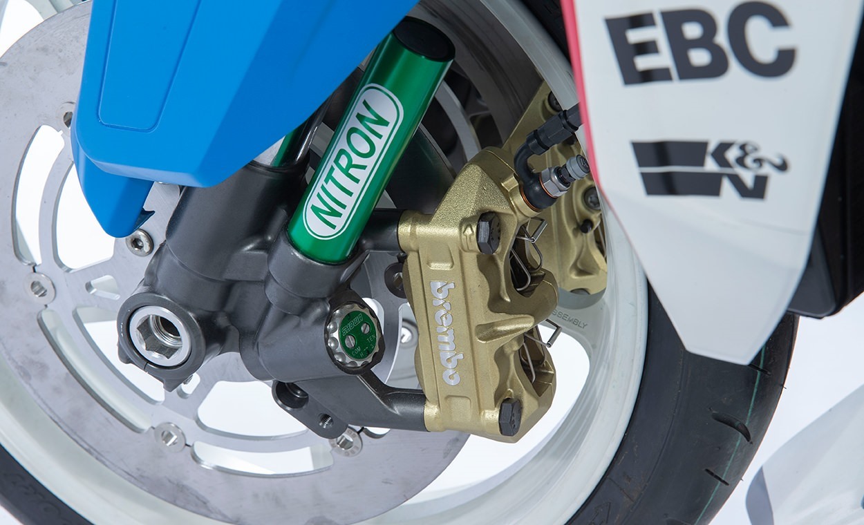 Тормозная система обеспечивается комплектом 310-мм двойных дисков в паре с двумя четырехпоршневыми суппортами Brembo спереди, а задний тормоз - однопоршневой суппорт Nissin.