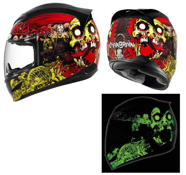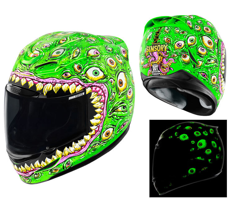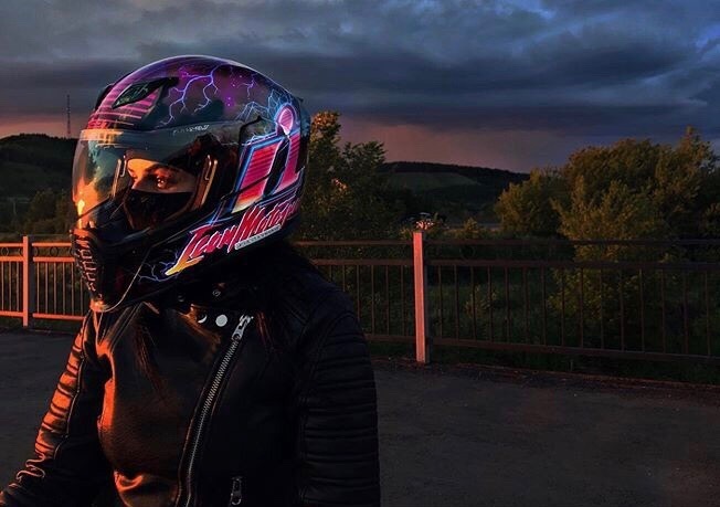 Экстравагантными считают окрасы с элементами фосфоресцентных пигментов, которые светятся в темноте. Выделяться из серой массы хочется даже в сумерках, а диковинки невольно цепляют взор. Владельцы мотошлемов могут купить готовый вариант со светящимся рисунком или сделать его самостоятельно, например, при помощи дополнительного нанесения краски баллончиком через трафарет.