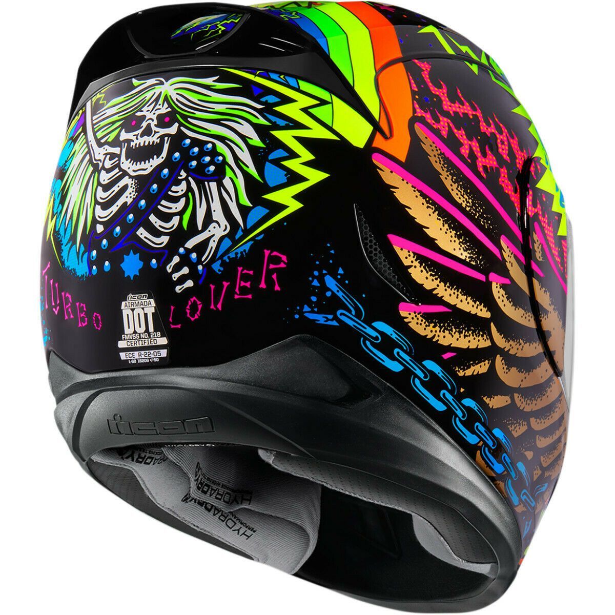 Каждый шлем сертифицирован, что подтверждают специальные знаки, которые можно увидеть сзади. Напомню, что Icon обладает несколькими сертификациями, а значит, мотошлем проверен на соответствие стандартам качества не один раз.