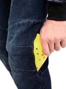 Преимущественно мотоджинсы поставляются с защитными вставками на коленях и/или бедрах.