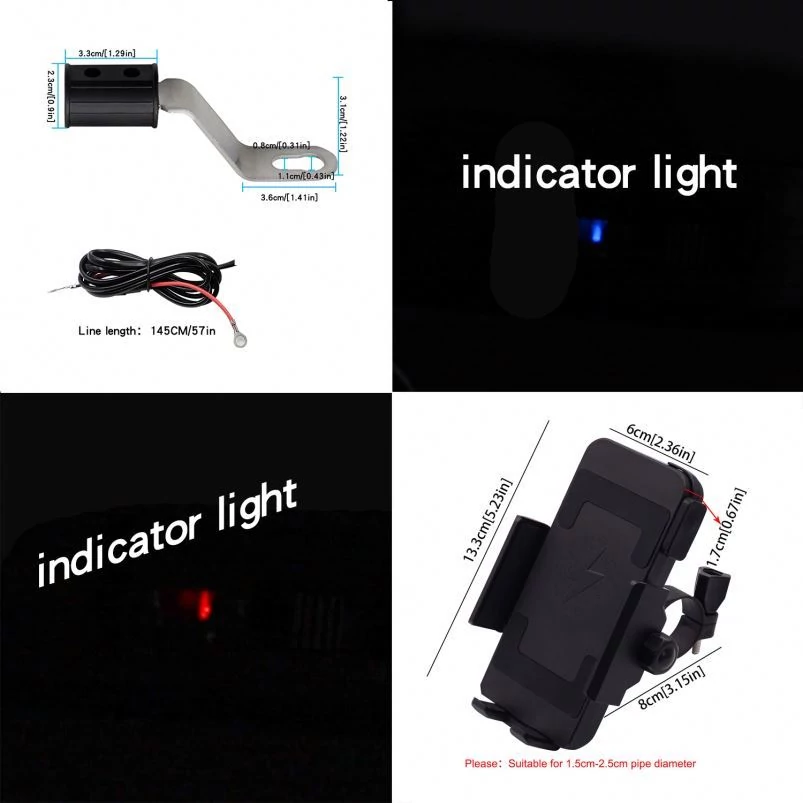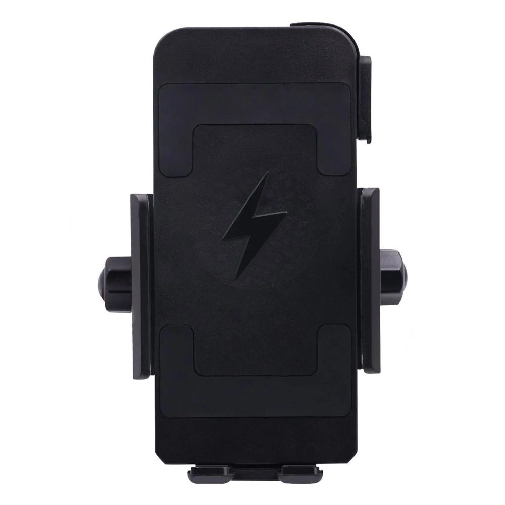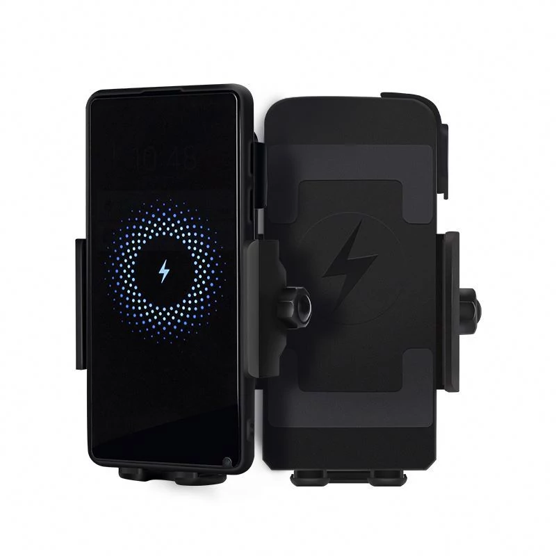 Универсальный держатель с функцией беспроводной зарядки телефона с функцией антишок (резиновый демпфер гасит вибрации, передаваемые на телефон). Совместим с телефонами 4.5-7 дюймов, поддерживающими беспроводную зарядку. Нижний и боковые фиксаторы раздвигаются для установки телефона любой диагонали. Фиксаторы имеют функцию затяжки на резьбе для прочного прилегания телефона. Резиновые прокладки между держателем и телефоном для предотвращения скольжения и повреждения задней стенки телефона от вибрации. Два варианта крепления: на руль и в любое болтовое соединение, например на зеркало. Для защиты имеется предохранитель.