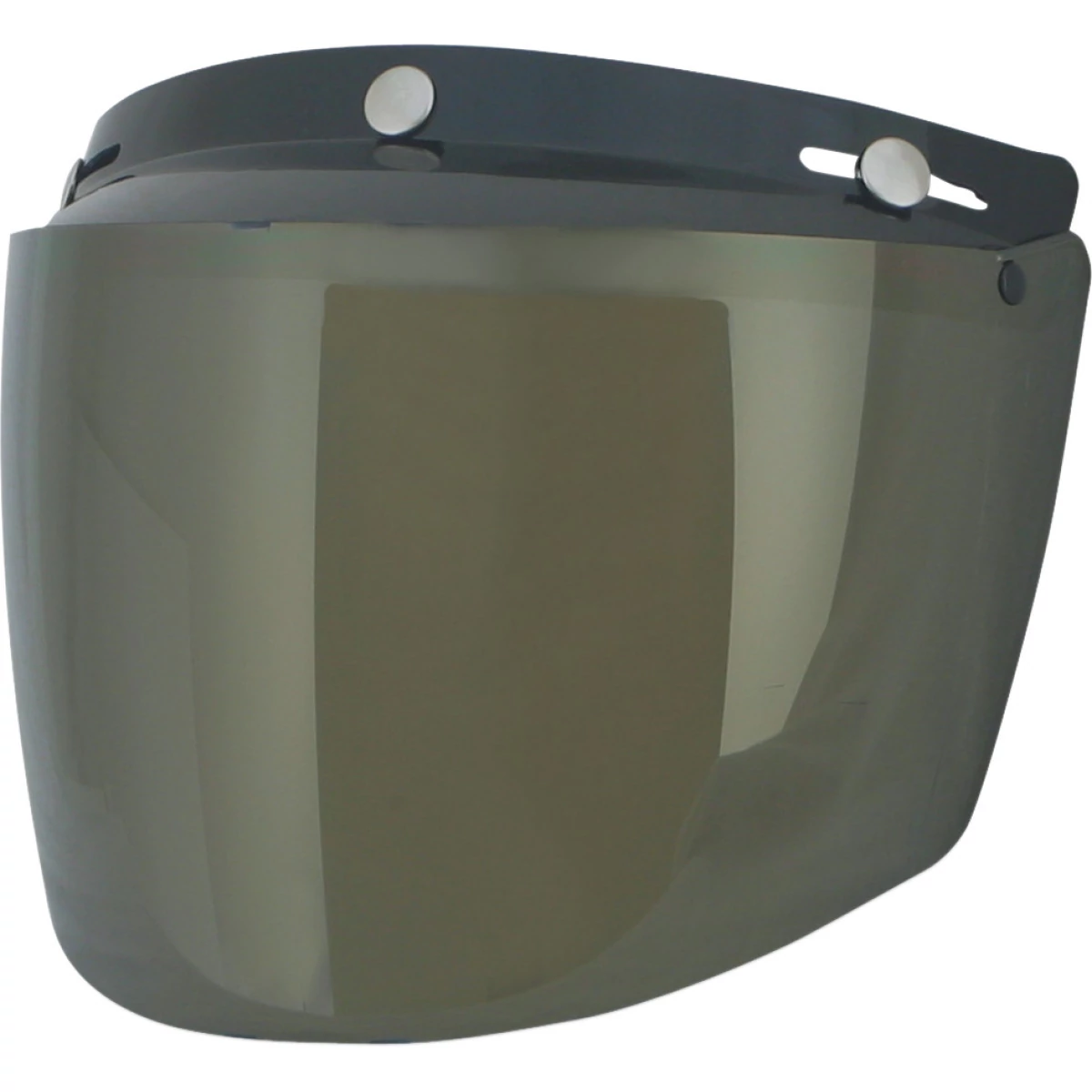Визор золотой зеркальный из поликарбоната и УФ-стойкого стекла, который имеет 3 кнопки для крепления к шлему.