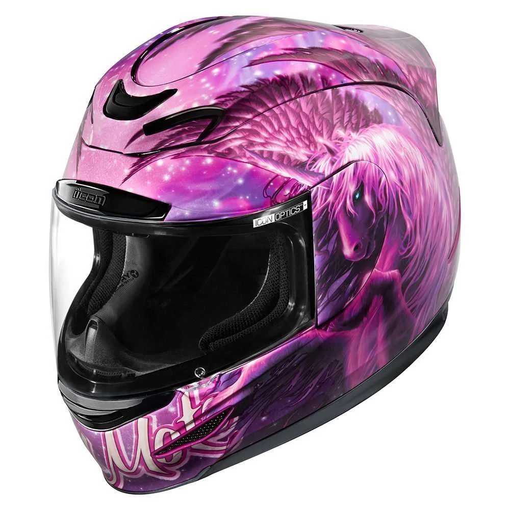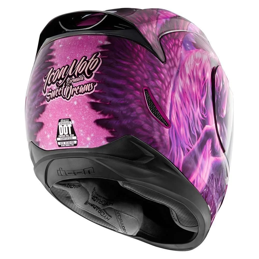 Мотошлем Icon Airmada Sweet Dreams – это интеграл, сочетающий в себе великолепные показатели надежности, комфорта и безопасности, украшенный истинно женской графикой с завораживающими розовыми единорогами. Такой элемент мотоэкипировки не только защитит прекрасную мотоциклистку в пути, но и обеспечит ей неповторимый внешний вид. Шлем прошел испытания и соответствует стандартам DOT FMVSS 218, ECE 22-05, SAI AS1698 и SG.