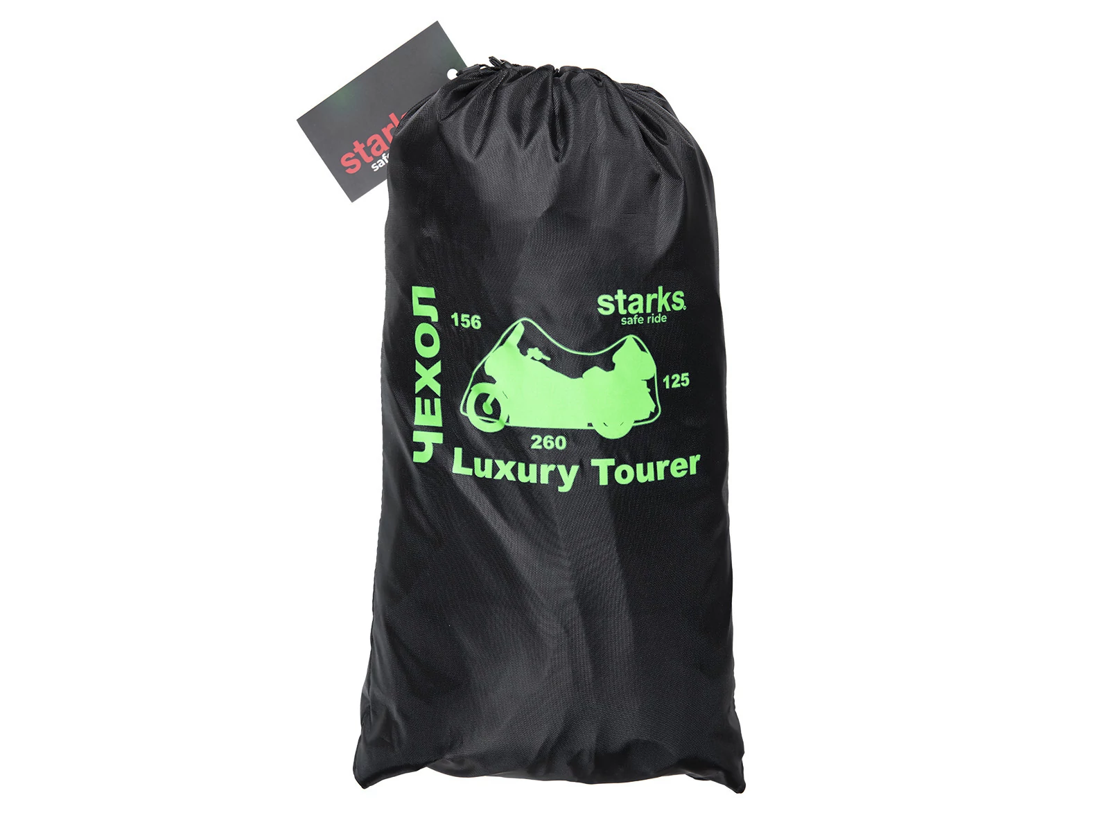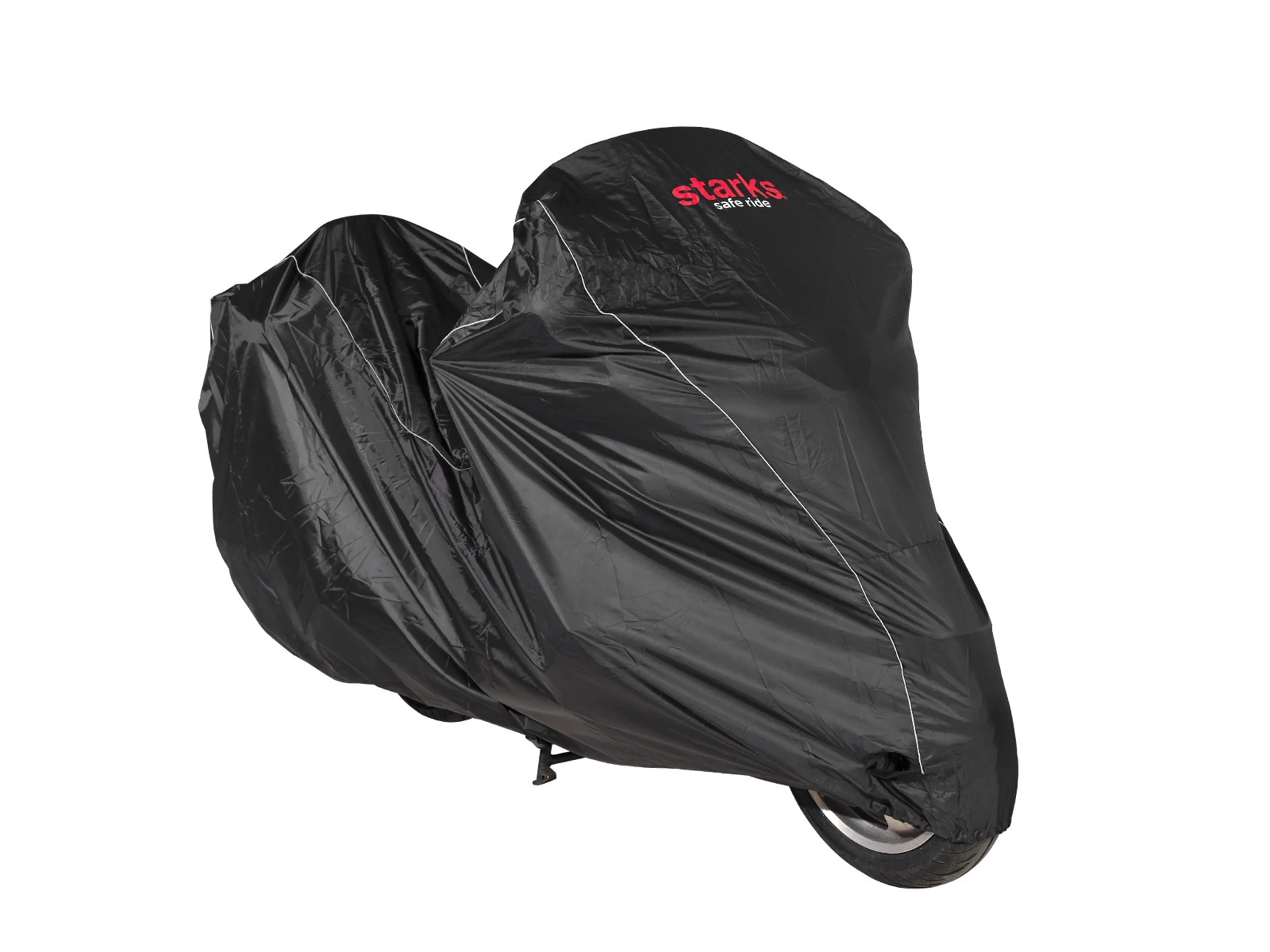 Выбирал чехол по двум параметрам - чтобы подходил по размерам, естественно, и чтобы хорошо от воды хранил. Этот чехол - хороший вариант, если у вас турер, и если часто планируете оставлять байк на улице. От воды защищает хорошо, как в принципе и от жарящего солнца, байк не нагревается. Немного пропускает конденсат, но это мелочь. Из фишек - светоотражающие полоски, блестят очень заметно