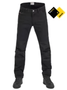 Мотоджинсы в отличии от гражданских могут будут выполнены из джинсы с нитью кевлара/арамида/кордуры или со вставками из этих тканей в местах истирания. Крой мотоштанов предусматривает особенности посадки на мотоцикле (вентиляция, стрейч вставки, длина, высокая полка поясницы, глубина карманов, ширина штаницы для использования наколенников).