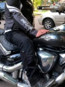 При посадке на мотоцикл край штанины не должен открывать ногу. Мотоштаны должны быть длиннее гражданский штанов.
