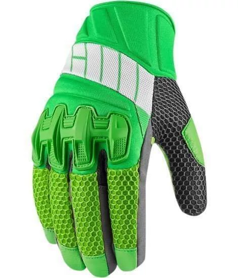 Зеленые мотоперчатки Icon Overlord 2 являются модифицированной моделью более ранней версии. Изменения коснулись, как внешнего вида, так функциональных особенностей. Так, со стороны ладони использована более износостойкая кожа кенгуру, а внешняя сторона выполнена из более прочной козлиной кожи. Кроме того, модель Overlord 2 дополнена интегрированными вставками из защитного материала Keratan, способного поглощать и рассеивать энергию при ударе. Также была немного видоизменена система вентиляции. Для этой цели используются воздухозаборники в области пальцев и костяшек. А собственно защита этих областей обеспечивается благодаря элементам из термопластика.
