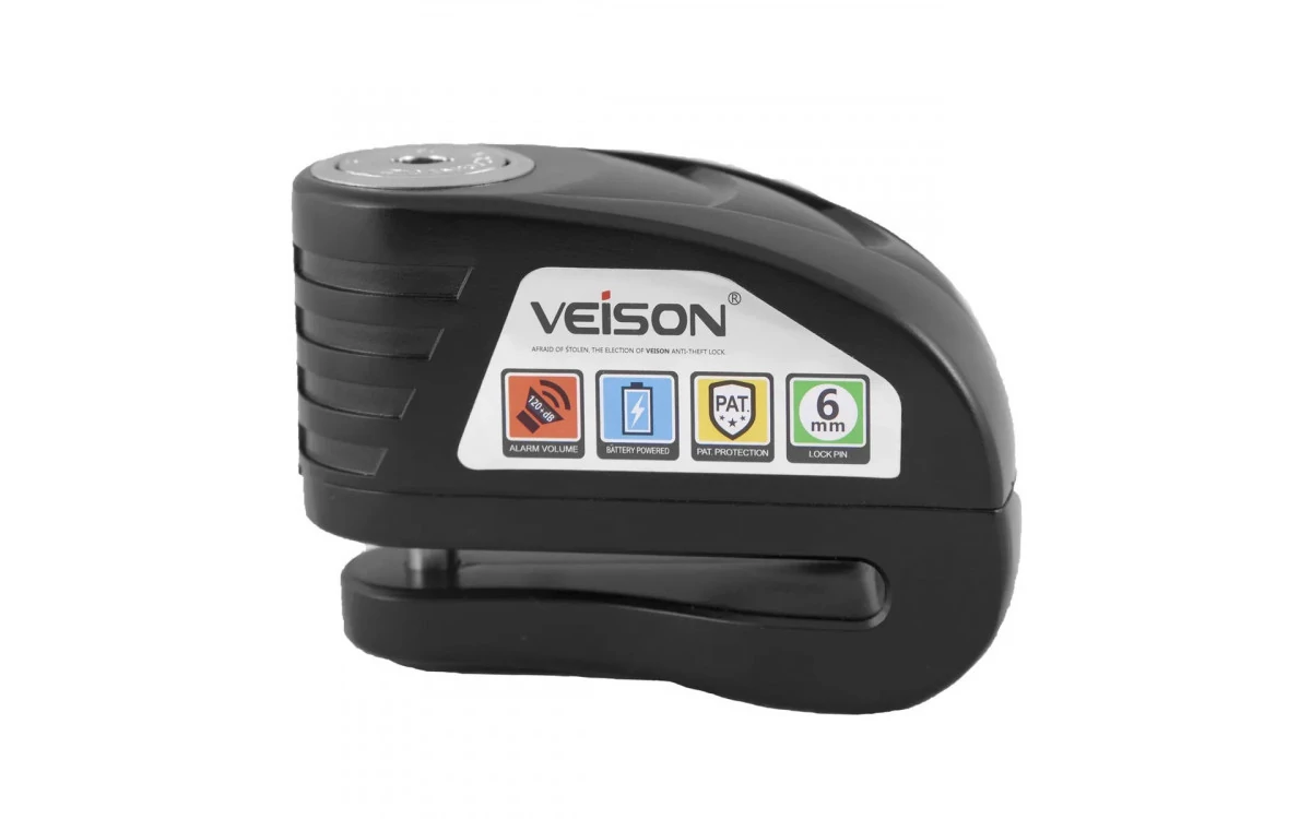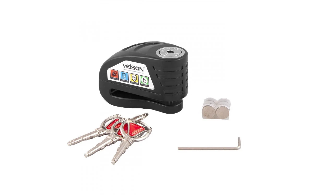 - Путём нажатия на цилиндр запирающего механизма, установить замок на передний или задний тормозной диск так, чтобы штифт запирающего механизма прошёл через отверстия в тормозном диске.