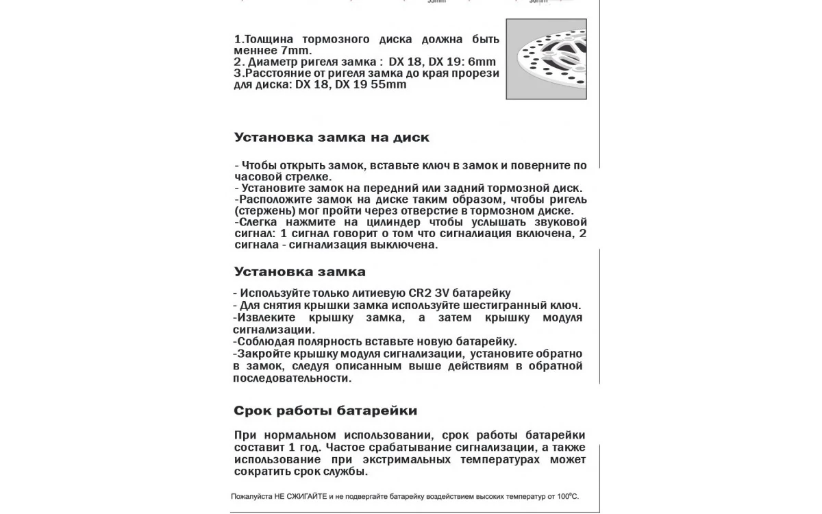 - В режиме «Охрана» при перемещении мотоцикла или механическом воздействии на замок сработает предупредительный сигнал, после чего при повторном воздействии на замок в течение 15 секунд сработает сигнализация, продолжительностью 30 секунд.